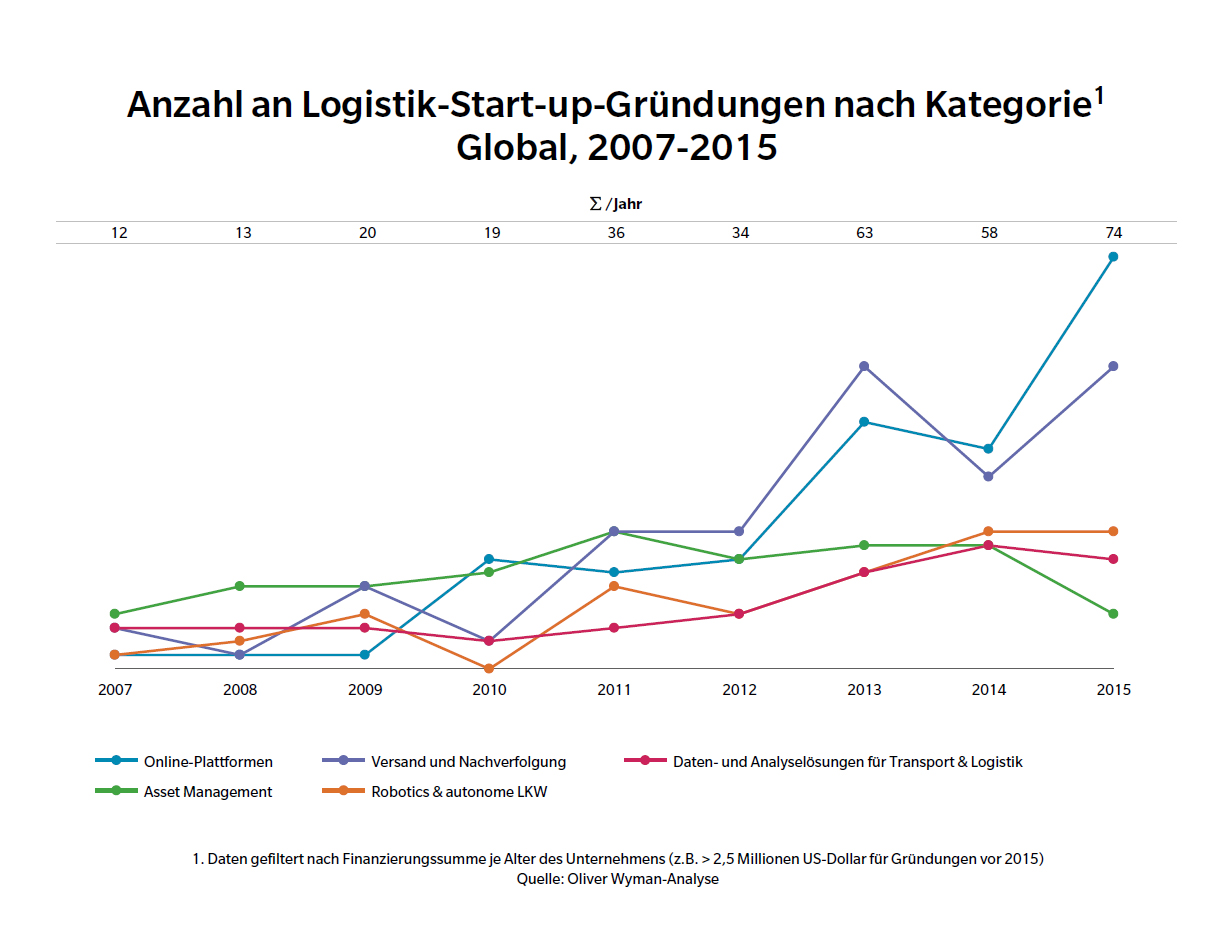 Sie heissen Flexport, UShip, Uber Freight oder Freighthub und sind dabei, die Logistiklandschaft zu revolutionieren. Wurden in den vergangenen Jahren Milliardenbeträge hauptsächlich in Start-ups aus dem Umfeld der Personenmobilität, wie Uber, BlaBlaCar oder Flixbus investiert, steht nun der Logistiksektor auf dem Plan der Investoren. Auch wenn die Newcomer vielen Logistikern heute überhaupt noch nicht bekannt sind, verändern sie die Branche bereits mit erheblichen finanziellen Mitteln. Der Analyse der Managementberatung Oliver Wyman zufolge beliefen sich allein die öffentlich bekannten Finanzierungsrunden von Logistik-Start-ups in den letzten zehn Jahren auf fast elf Milliarden Euro. Im Schnitt wird alle fünf Tage ein neues Logistik-Start-up gegründet.