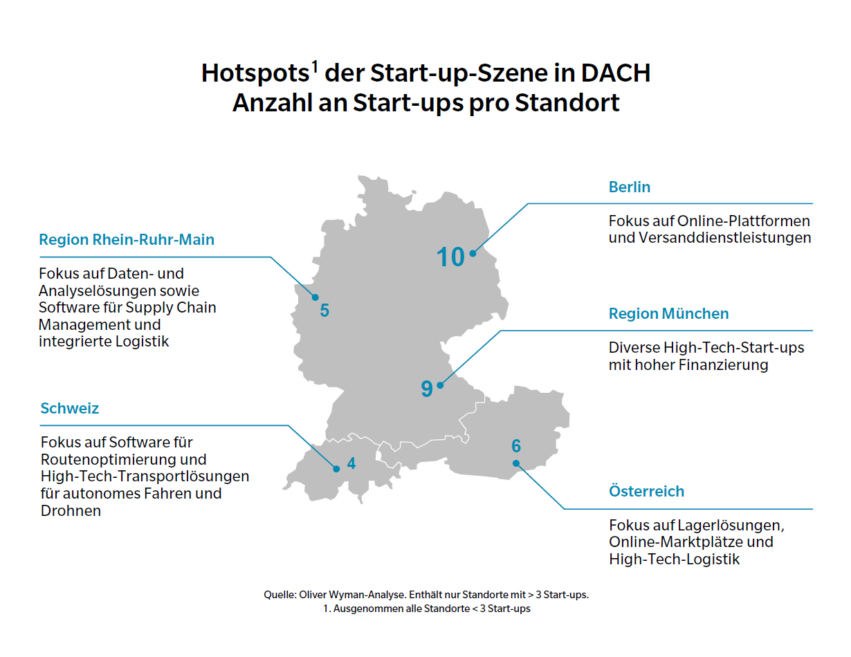 In der Schweiz erfolgt das Umdenken langsam. Seit 2016 engagiert sich Branchenführer Kühne + Nagel etwa bei dem Start-up-Bootcamp Smart Transportation & Energy. Ziel der Kooperation ist es, das Kerngeschäft von Kühne + Nagel mit jungen Unternehmen in Kontakt zu bringen und Innovationsimpulse zu sammeln. Insbesondere bei der Investition und Wachstumsförderung lokaler Start-ups bleibt die Schweizer Logistikwirtschaft aber zögerlich. Oliver Wyman-Principal Borreck: „Im deutschsprachigen Raum gibt es mehr als 40 interessante Start-ups im Logistikumfeld. Der Austausch mit Schweizer Logistikunternehmen findet bisher wenn überhaupt nur sehr zögerlich statt. Das kann langfristig zu einem Wettbewerbsnachteil für den Standort Schweiz werden.“