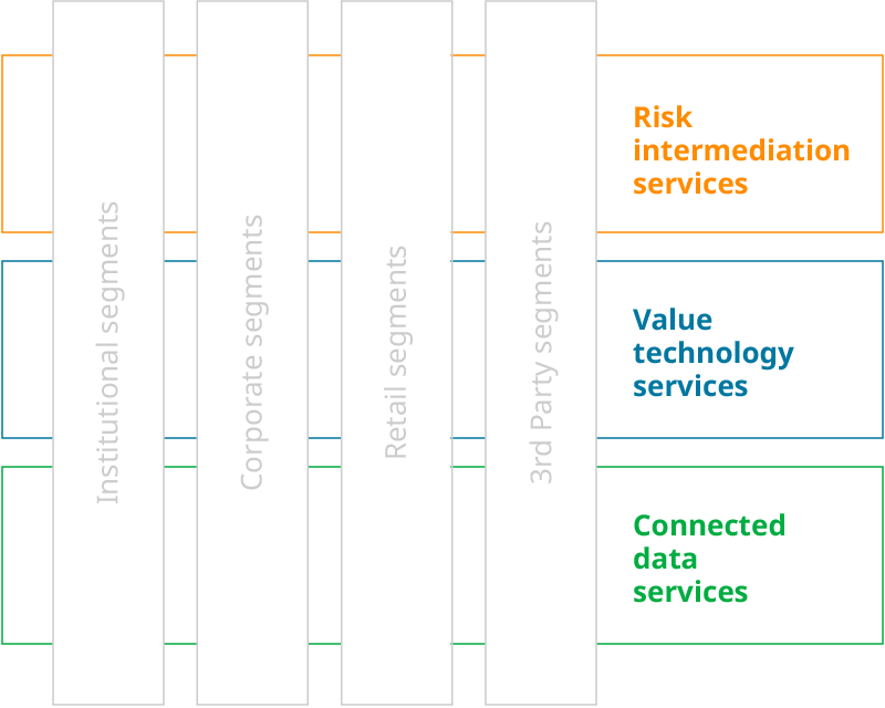 Just as the relative value and speed of growth momentum of risk intermediation services has waned, the value of technology and data services is rapidly increasing, in myriad ways. Some of these services involve the evolution of risk intermediation toward services that help customers better understand their own risk profile and reduce it. For example, instead of providing a general price on car insurance, companies can use far more accurate data to help customers reduce the chances of having a car crash and therefore the amount and cost of insurance required. Or a bank can use analysis of customers’ spending behavior to help them avoid credit charges or even default. In some instances banks, particularly in Asia, are starting to use social media data to improve underwriting and offer better terms to good credit customers.