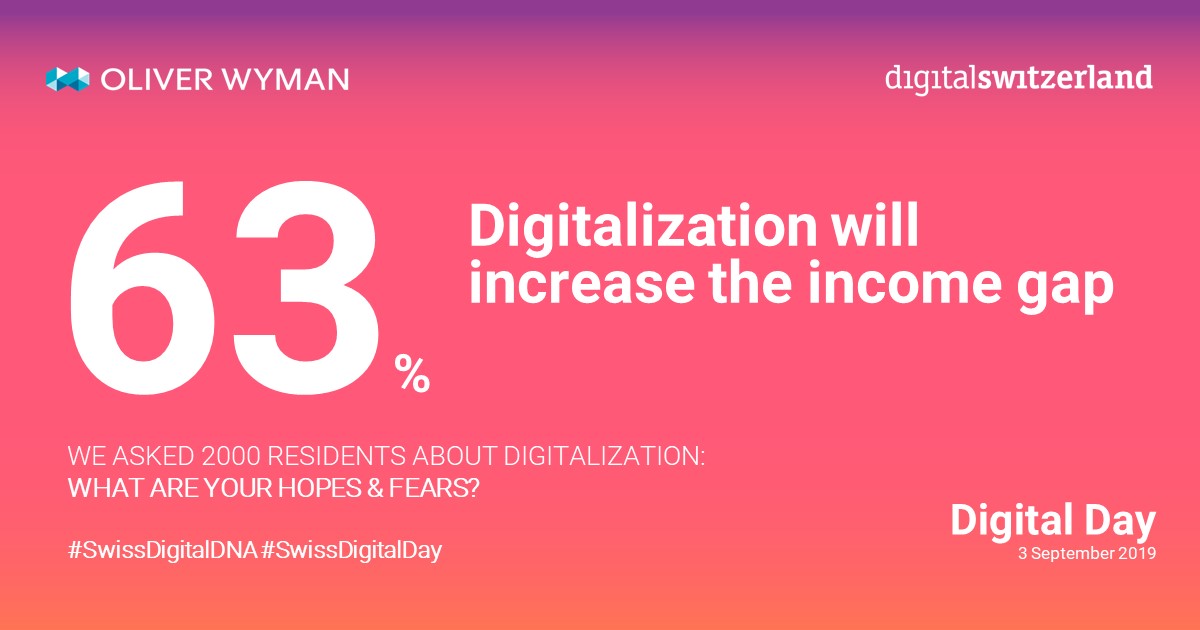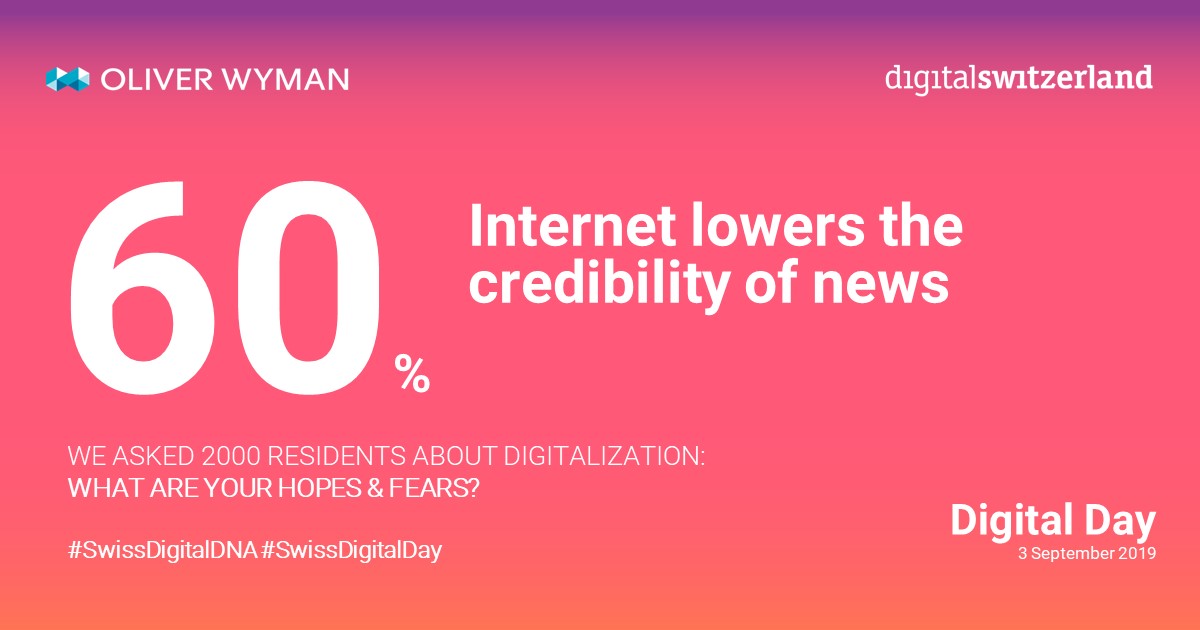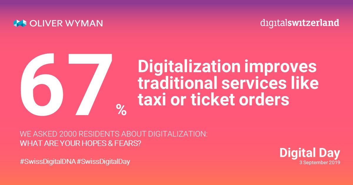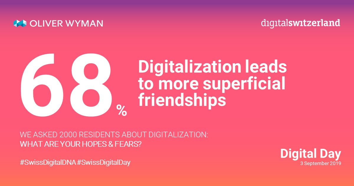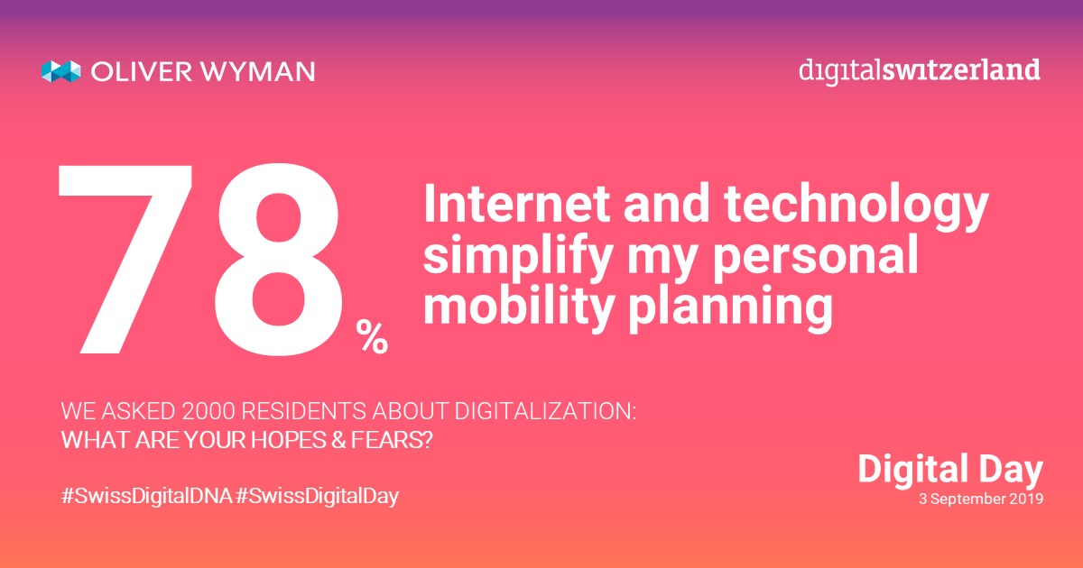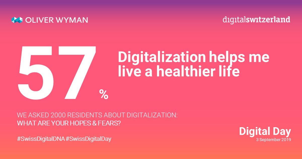 Oliver Wyman und digitalswitzerland untersuchen zum dritten Mal die digitale DNA der Schweiz. Für die Studie „Switzerland’s Digital DNA“ befragte Oliver Wyman 2000 Schweizer in den beiden großen Landessprachen Deutsch und Französisch hinsichtlich ihrer Einstellung zum Thema Digitalisierung. Befragt wurden sie unter anderem zu den Themen Internetznutzung, Hoffnungen und Ängste, Vertrauen sowie zukünftige Veränderungen im Zuge der Digitalisierung.