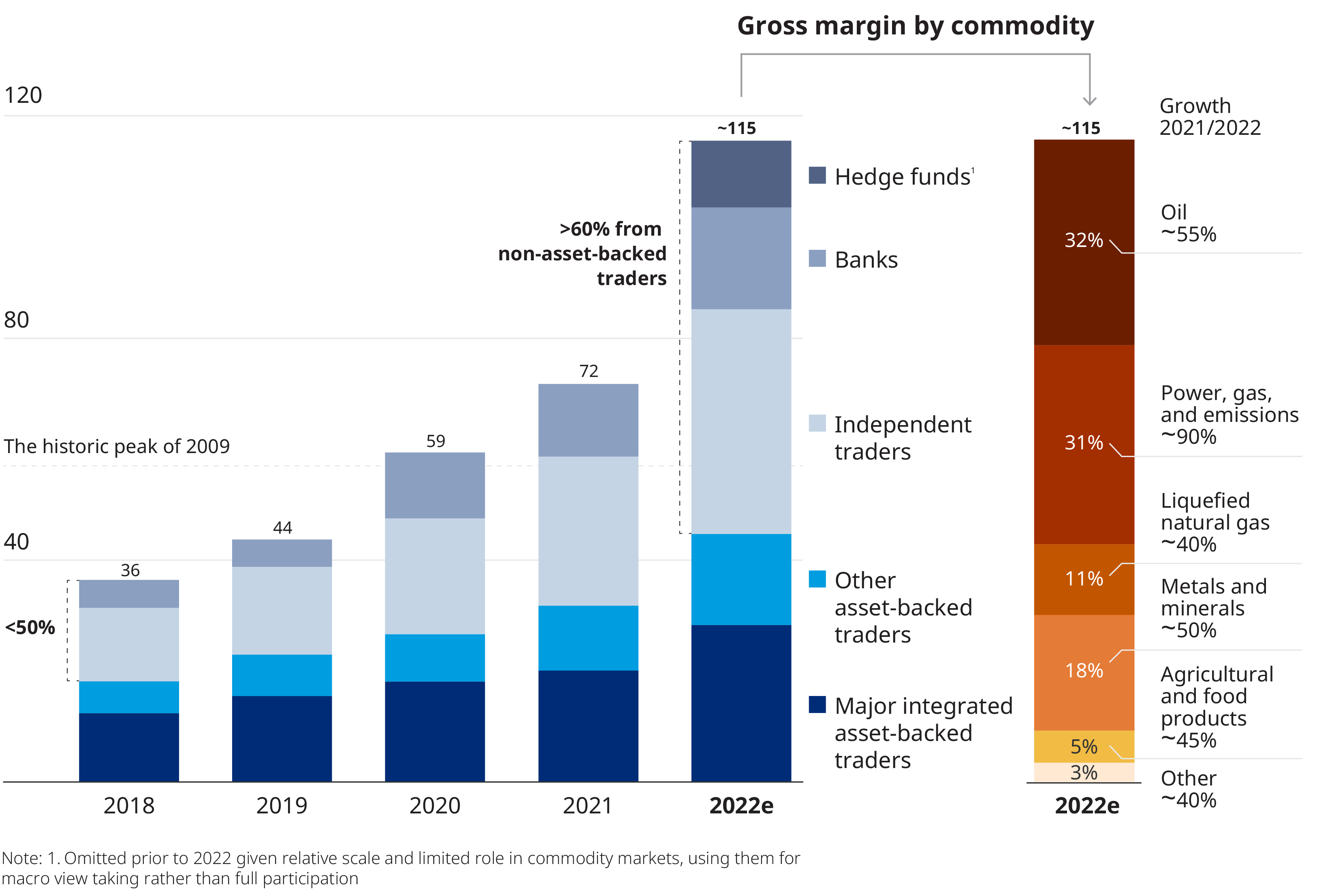 The commodity trading industry set an all-time record in 2022 for gross margin, surpassing $100 billion. Following record levels in 2020 and 2021, industry revenue has nearly tripled since 2018, when it was $36 billion, and has nearly doubled the $57 billion in gross margins in 2009 when markets boomed after the global financial crash (see exhibit).